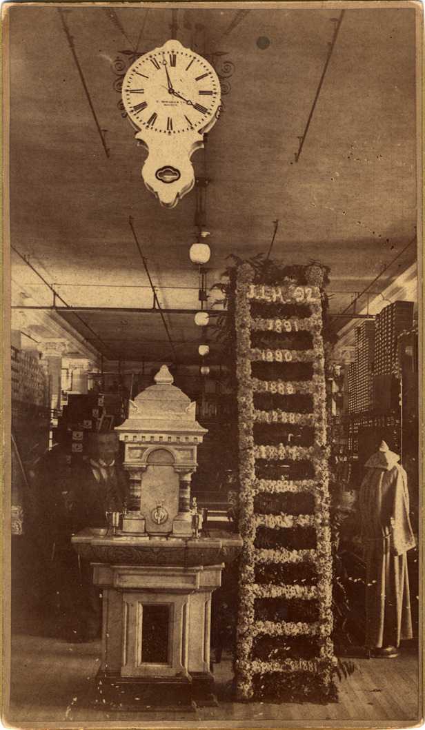 Interior view of J.L. Hudson Co.; clock suspended from ceiling; floral arrangement in the shape of a ladder, on rungs (descending): J.L.H. '92, years 1891 through 1881 on each rung. Stone fountain or statuary next to ladder; robe on dressmakers form to the side; man wearing a tie stands in background. Handwritten on back: "Interior, Hudson's 12th anniversary."