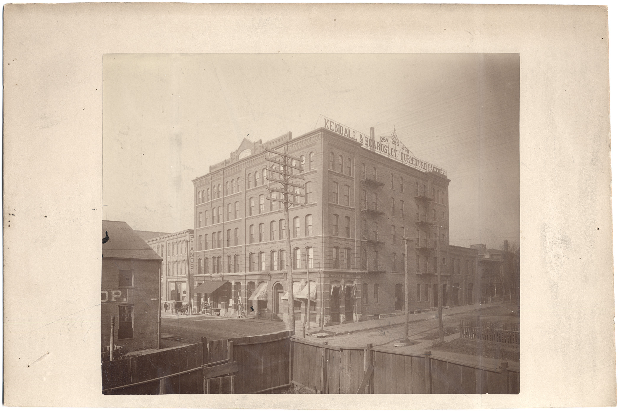 View of multistory brick building from corner; fire escapes; wooden fence in foreground. Wire sign on building: "Kendall & Beardsley furniture factory, 264, 266, 268." Handwritten on back: "cor. Congress and Fifth, 1886." Label on back: "I ... do hereby approve the within photograph of ... , as one satisfactory to have a ... engraving made from, according to contract made with Munsell & Co."