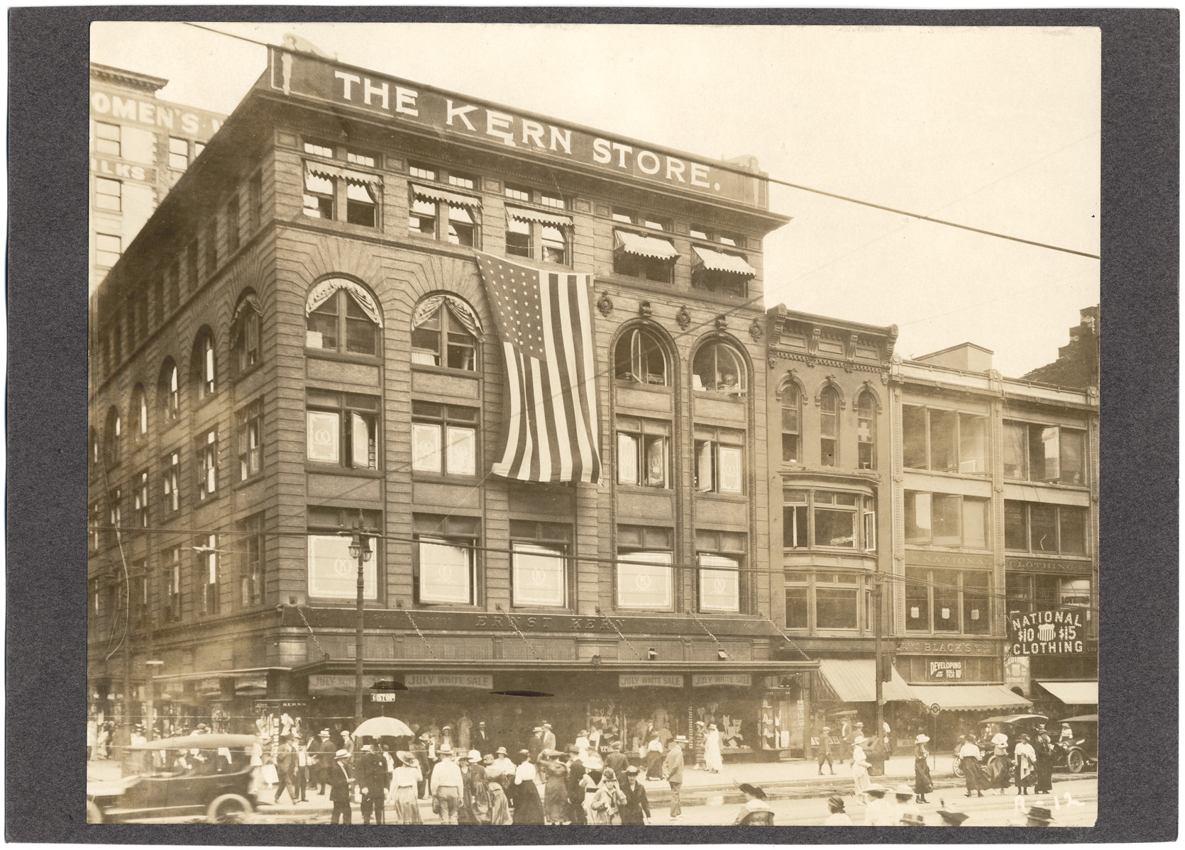 Five-story building; sign on roof: "The Kern Store"; American flag hangs on faðcade of building; people and automobiles crossing street; sign over windows: "July white sale." Label on back: "Woodward Ave. & Gratiot S.E. corner, 1919."