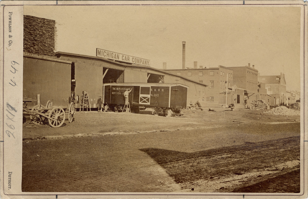 Exterior of Michigan Car Company building. Railroad car protrudes from warehouse door; man stands on stepladder painting side of car which reads: "The Milwaukee Line, between New York and..." Dirt road in foreground and other businesses down street. Printed on front: "Powelson & Co., Detroit." Handwritten on back: "McMillan & Newberry." Printed on back: "Powelson & Co., Opera House Gallery, Detroit, Michigan."