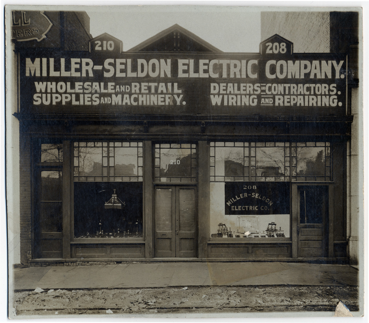 View of storefront displaying electrical lamps, levers and other parts. Sign on building: "Miller-Seldon Electric Company, wholesale and retail supplies and machinery, dealers and contractors, wiring and repairing, 210, 208." Stamped on back: "Chas. C. Brewe, successor to Alvord & Co., com'l photographers, 45 Rowland St., Detroit."
