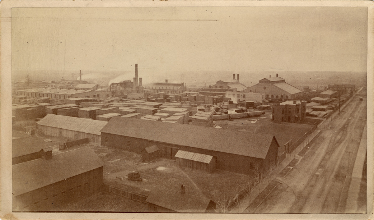Favorite this☆ Peninsular Car Works Description: View of factory buildings in distance; piles of lumber in storage yards; group of low buildings in foreground; road on right. Handwritten on back: "Peninsular Car Works, 1883, Ferry Ave. near DGH&M Ry by junct." Details Resource ID: DPA3290 Subject: Factories--Michigan--Detroit Railroad equipment industry--Michigan--Detroit Albumen prints Photographic prints Date Issued: 1883 Format: 1 photographic print mounted on mat board ; image 4.5 x 7.5 in. Member of: Burton Historical Collection Filing Location: D/Industries & business houses-Peninsular Car Works Rights: Physical rights are retained by DPL. Copyright is retained in accordance with U.S. copyright laws.