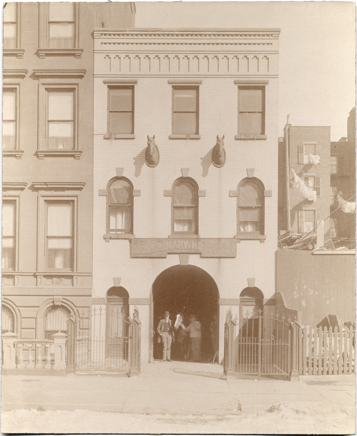 View of three-story brick building; two men, holding a horse by the bridle, stand under a rounded arch doorway; two reproductions of horses heads project from building facade; sign "Veterinary Hospital" over entrance; iron fence in front of building. Handwritten on back: "N.Y. city ste. bd. of health bet. hosp. on 57th st. where our horses are boarded."