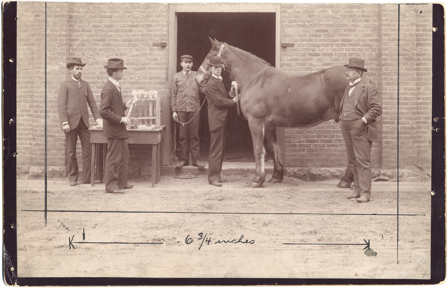 Man holds horse by rope and harness in front of brick building; two men stand next to table with large glass vials in holder; one man stands next to horse holding glass vial and cloth against horse's neck; another man stands to the side. Handwritten on photograph: "6 3/4 inches." Stamped on back: "From Alvord & Co., exclusively commercial photographers, 55 Rowland St., Detroit, Mich., ground floor."