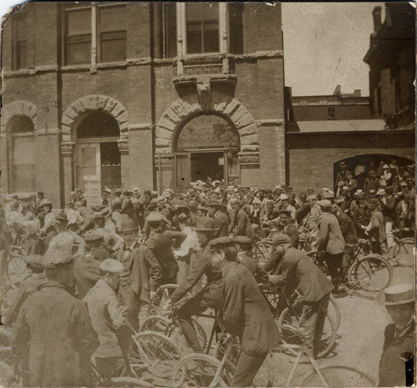 Favorite this☆ Crowd on bicycles Description: Crowd of men and women, most on bicycles, in front of brick building. Handwritten on back: "Pd. employees arriving for work." Details Resource ID: DPA3315 Subject: Employees--Michigan--Detroit Photographic prints Date Issued: Unknown year Format: 1 photographic print mounted on mat board ; image 3.75 x 4 in. Member of: Burton Historical Collection Filing Location: D/Industries & business houses-Parke Davis & Co. Rights: Physical rights are retained by DPL. Copyright is retained in accordance with U.S. copyright laws.