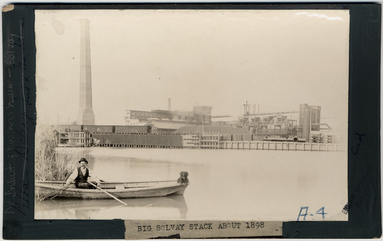 Solvay Process Company factory viewed from river, with man and dog in rowboat in foreground. Typed on label on mat front: "Big Solvay stack about 1898." Handwritten on photograph front: "A-4." Handwritten on mat back: "Alex Lesprance (?)."