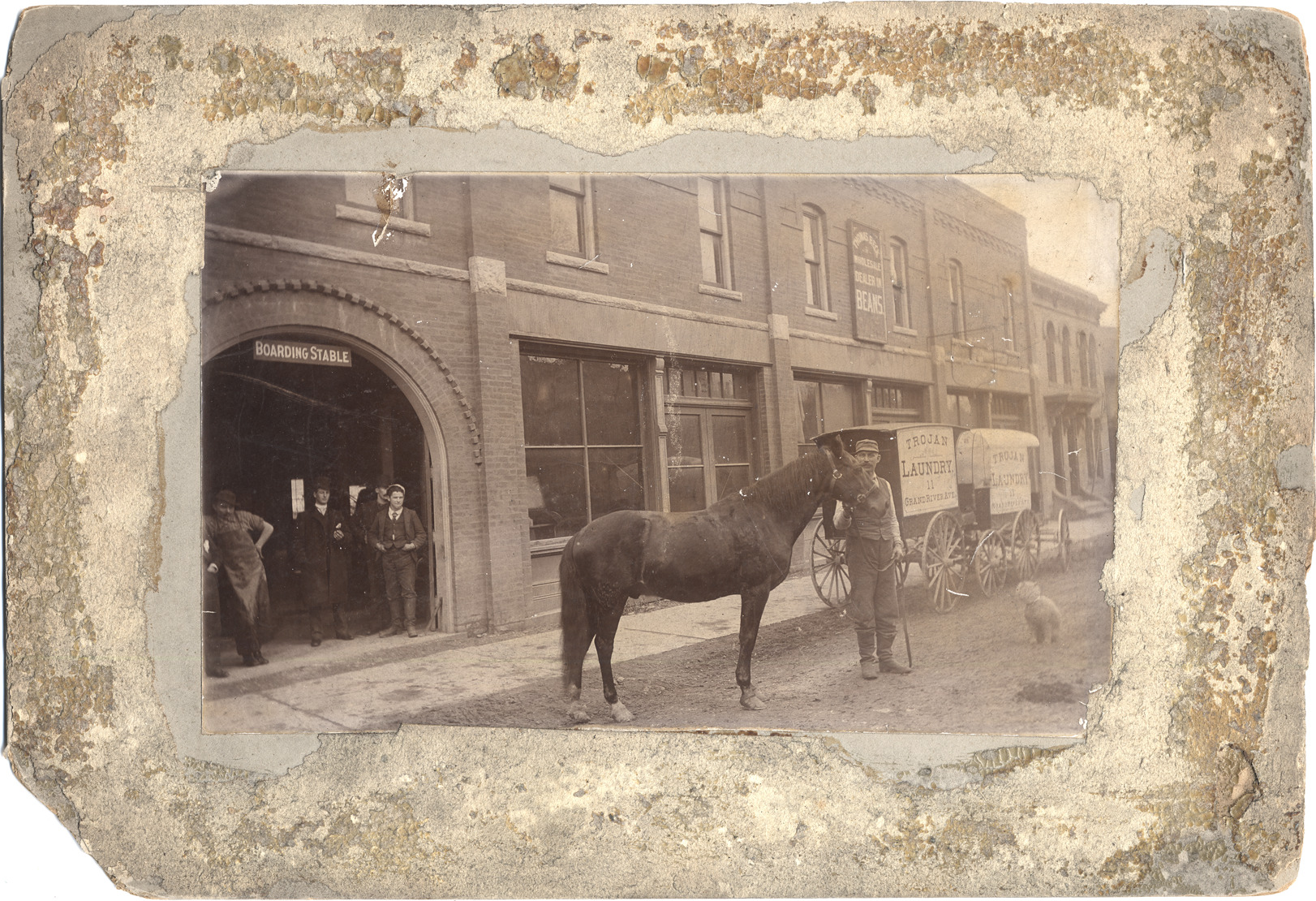 Man holding horse by bridle, stands in front of wagon in street. Painted on side of wagon: "Trojan Laundry, 11 Grand River Ave." Four men stand under a brick arched entry with sign: "Boarding stable." Small dog in street. Handwritten on back: "C.D. 1910 = Grand River Ave." Damage to mat.