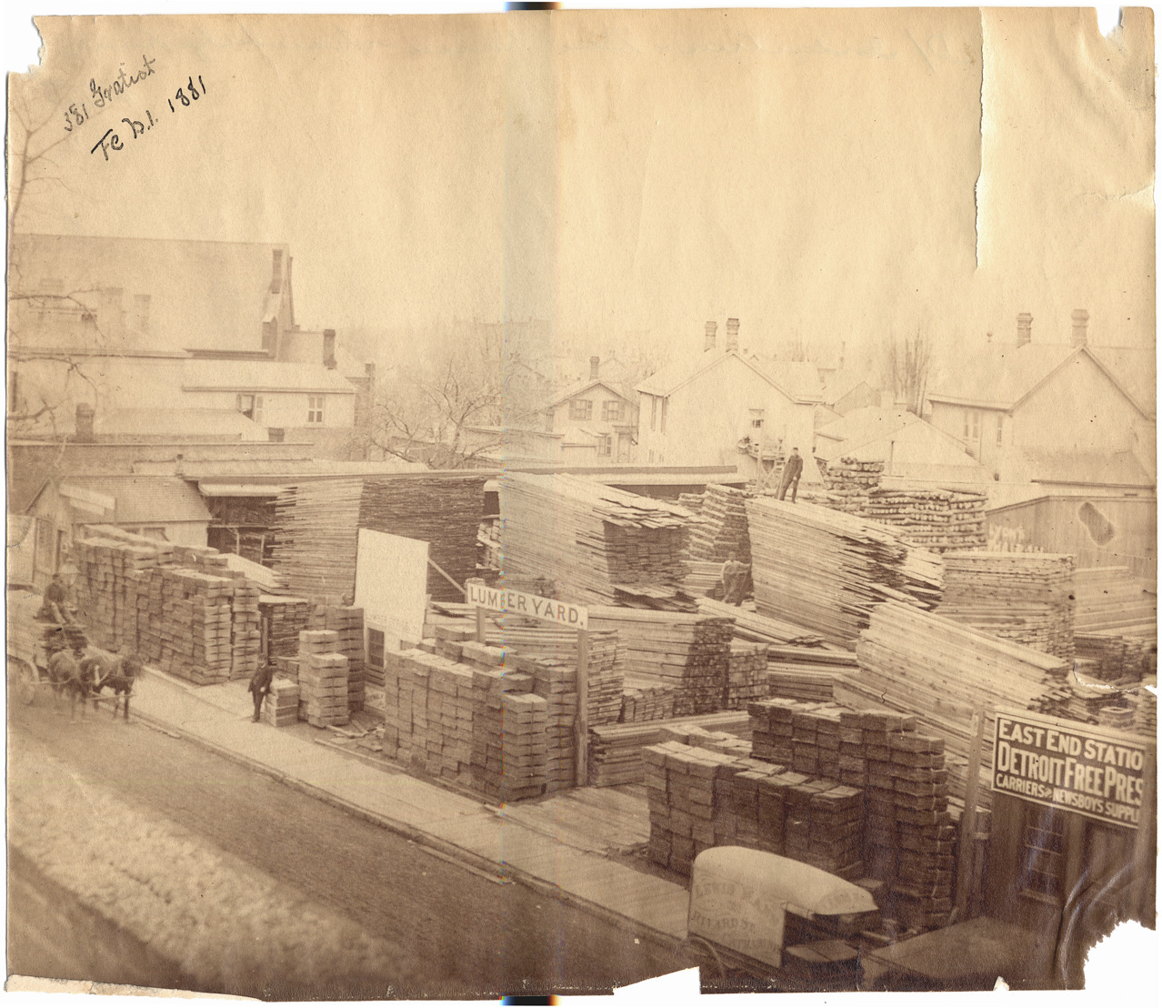 View of lumber yard; stacks of lumber; man stands on top of one stack; horse-drawn wagon in street; sign in front: "Lumber yard." Sign on small structure at right: "East End Station, Detroit Free Press, carriers and newsboys suppl ..." Handwritten on front: "381 Gratiot, Feb. 1, 1881."