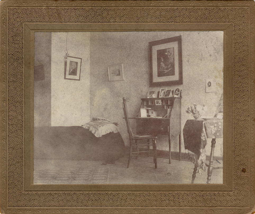 Interior of bedroom; bed in corner, small desk with photographs on top and chair beside, small table covered with tablecloth and flowers on top. Paintings hang from walls, light bulb hangs down from ceiling. Handwritten on back: "38 Plum Street, Detroit (?)."