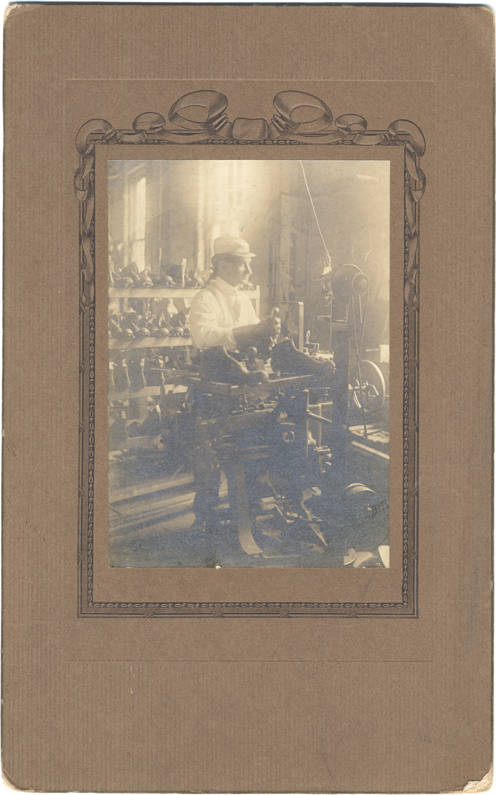 Man wearing hat and leather gloves at machine, assembling shoes. Shelves of unfinished shoes behind him.