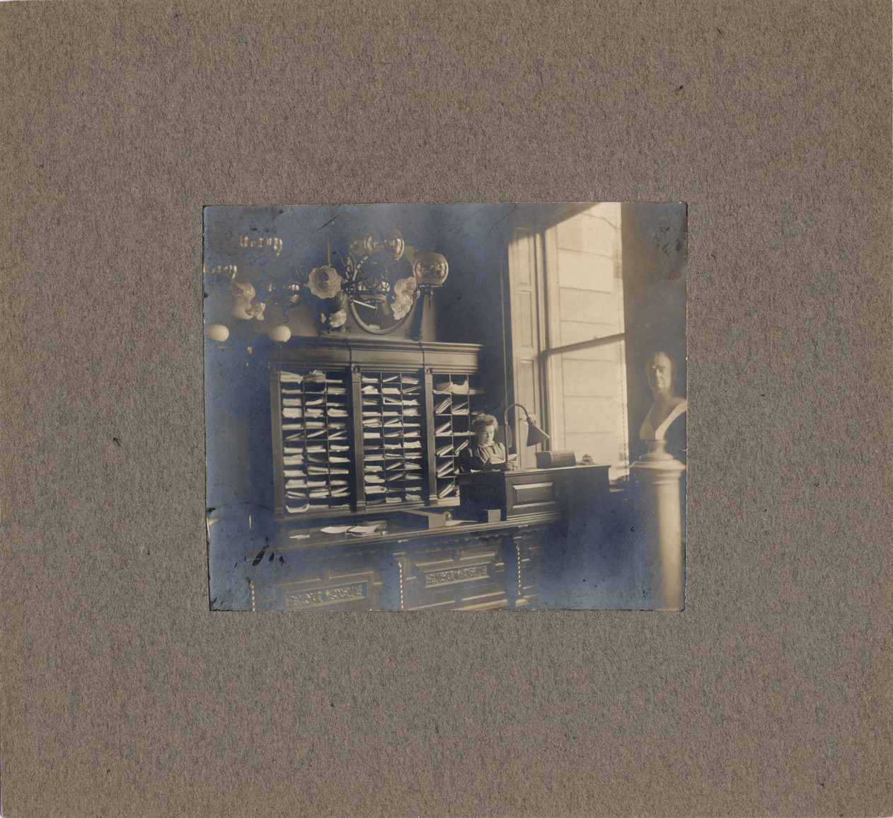 Main Room at Detroit Public Library, old building located on Gratiot Avenue. Desk with decorative woodwork, and storage shelves holding books and periodicals. Young lady stands with book behind desk. Glass chandelier hangs from ceiling, unidentified bust on right side of photo. Typed on back: "Main room, Old Main, 1875."
