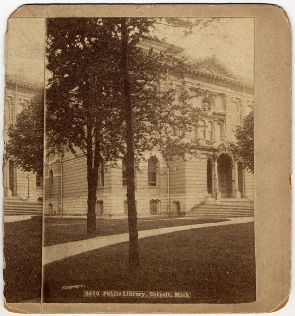Half of stereocard showing exterior of Detroit Public Library on Gratiot Avenue between Library and Farmer Streets, between 1875 and 1921. Three-story brick building, with arched windows, bust of unknown figure carved into front, and steps leading to pillared entrance, lamps on either side of entraceway. Most of building is blocked by trees lining sidewalk. Printed on front: "2570 Public Library, Detroit, Mich."
