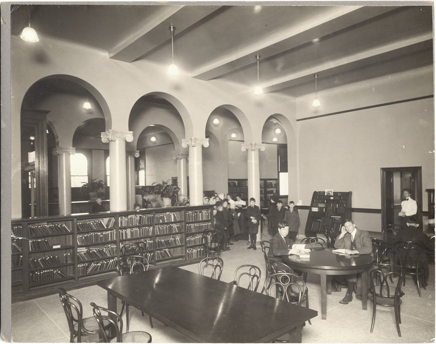 View of the reading room in the Hosmer Branch Library, Detroit Public Library. Corinthian columns and arches divide room; tables and chairs; group of children stands just outside room; two men seated at a table; woman stands in doorway. Label on back: "Hosmer Branch - Reading Room." Stamped on back: "C.C. Brewe, com'l photographer, 205 Griswold St., Detroit, Mich. General viewing, copying, developing and printing for amateurs."