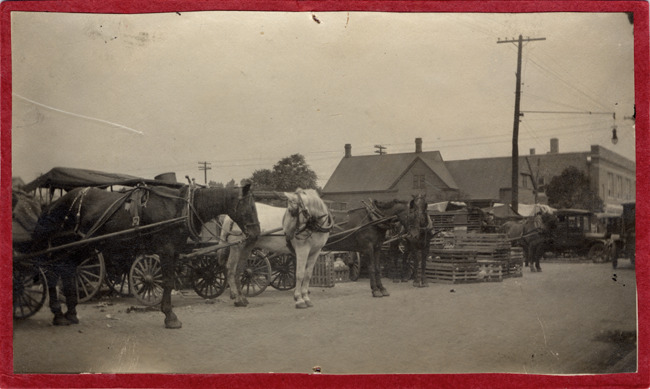 Favorite this☆ Vehicles at farmers' market Description: Vehicles at farmers' market: horse-drawn carriages, horse-drawn wagons, automobiles. Stack of wooden crates; brick building in background; utility poles. Handwritten on card back: "6." Photograph hand-trimmed. Details Resource ID: DPA3416 Subject: Farmers' markets--Michigan--Detroit Carriages and carts--Michigan--Detroit Automobiles--Michigan--Detroit Photographic prints Date Issued: Unknown year Format: 1 photographic print mounted on cardboard ; image 2.5 x 4.25 in. Member of: Burton Historical Collection Filing Location: D/Markets Rights: Physical rights are retained by DPL. Copyright is retained in accordance with U.S. copyright laws.