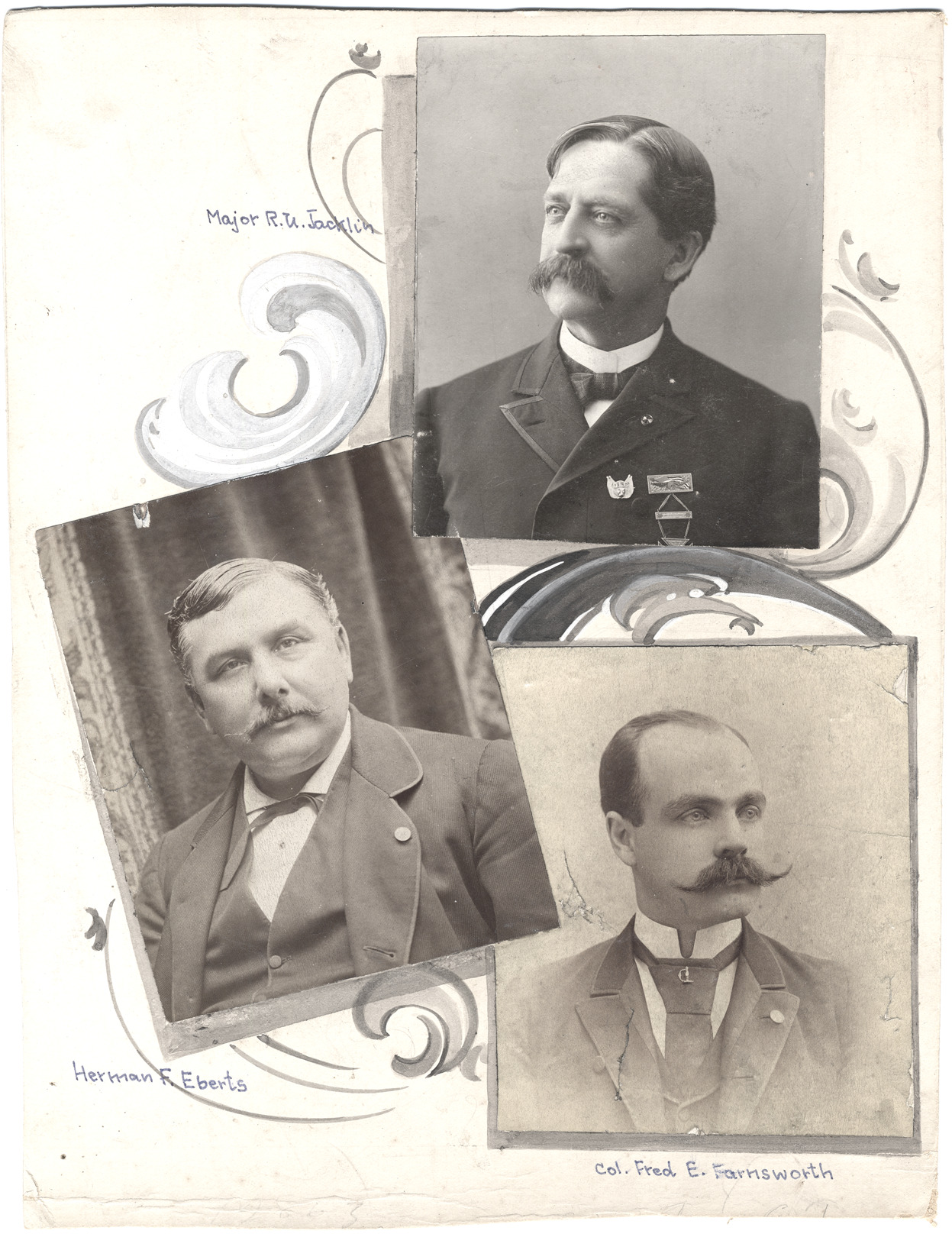 Favorite this☆ Members of the Detroit Light Guard Description: Individual portraits of three members of the Detroit Light Guard wearing jackets and ties. Handwritten on front, clockwise from top: "Major R. U. Jacklin; Col. Fred E. Farnsworth; Herman F. Eberts." Scroll decoration painted on front of mat. Details Resource ID: DPA3440 Subject: Michigan. National Guard. Infantry, 225th. Battalion, 1st Soldiers--Portraits Photographic prints Date Issued: Unknown year Format: 3 photographic prints mounted on mat board ; image 9.5 x 7.5 in. Member of: Burton Historical Collection Filing Location: D/Militia-Detroit Light Guard Rights: Physical rights are retained by DPL. Copyright is retained in accordance with U.S. copyright laws.