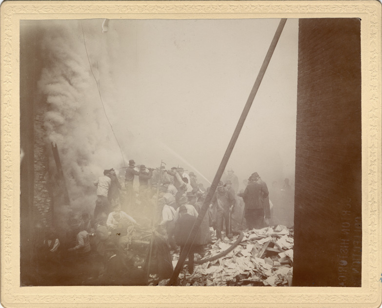 Fire fighters spray water on wreckage of Detroit Journal building, while men look through rubble. Thick smoke boils up on left. Handwritten on card back: "Journal explosion, Nov. 6/95. 4."