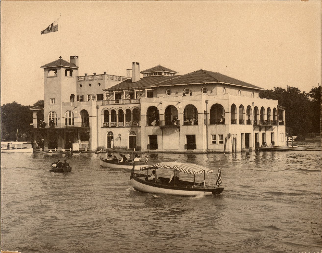 Stucco-surfaced concrete building with arched colonnaded porches and boat ramps, viewed across water. Motor launches and motor-powered small boat in foreground; two men in canoe near entrance. Several people on porches. Printed on photograph front: "Copyright 1905 by Detroit Publishing Co." Handwritten on card back: "Launch in foreground took members to the Owen Park boat landing. 74." Printing on photograph front almost cut off; photograph chipped at corner.