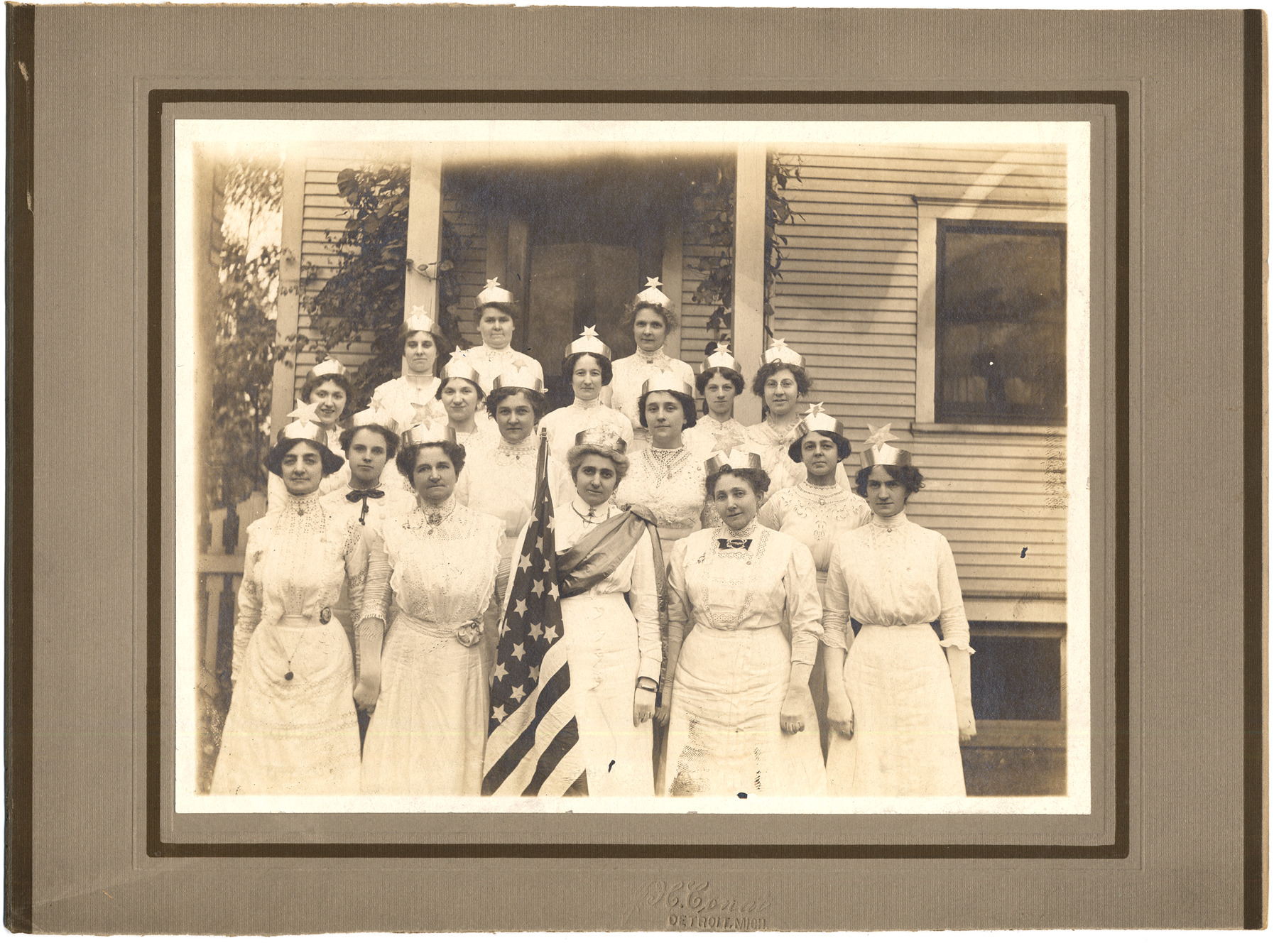 Group of women pose in front of a wooden-frame house wearing white lace dresses and silver headbands decorated with a five-pointed star. Woman in front row wears sash and carries an American flag. Embossed on front: "H. Conat, Detroit, Mich." Handwritten on back: "Eastern Star Ladies, Mrs. Fred Pramstaller, 1115 Seyburn, Detroit, 1909."