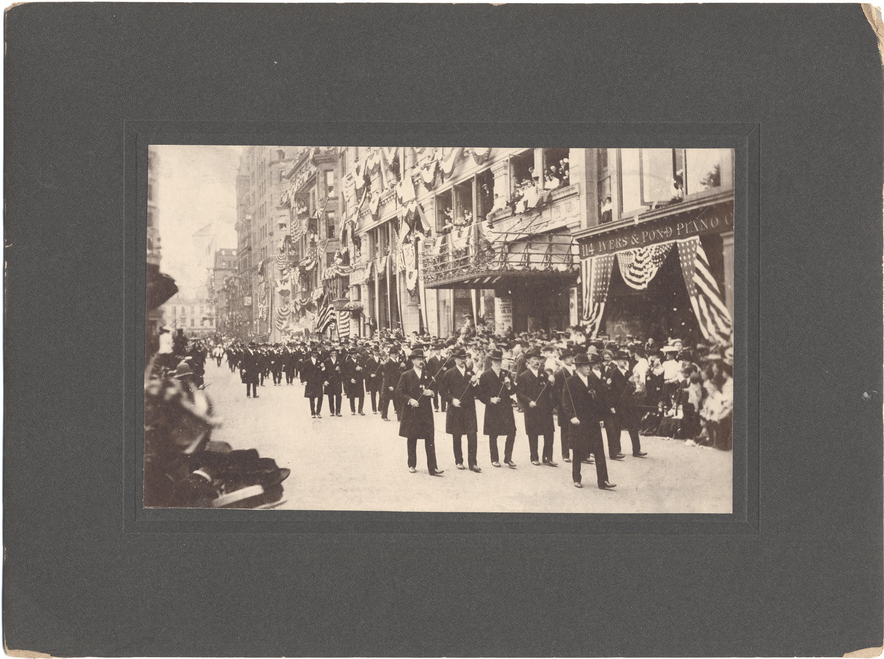 Members of the Grand Army of the Republic march in formation, wearing topcoats and hats and carrying batons. Buildings decorated with bunting; spectators watch from sidewalk and building windows. Handwritten on back: "Det. Post ... parade, Boston Tuesday, Aug. 18, 1904, Detroit Post G.A.R." Label on back: "G.A.R., Dept. of Mich., Detroit Post, 384. Annual encampment, Boston, 1894."
