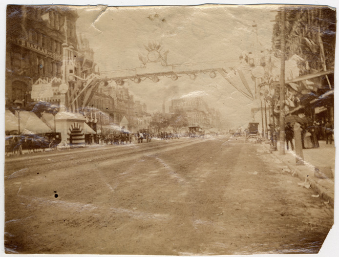 Arch over street painted with stripes; medallions suspended from arch; horse-drawn vehicles in street. Handwritten on back: "GAR 1891."