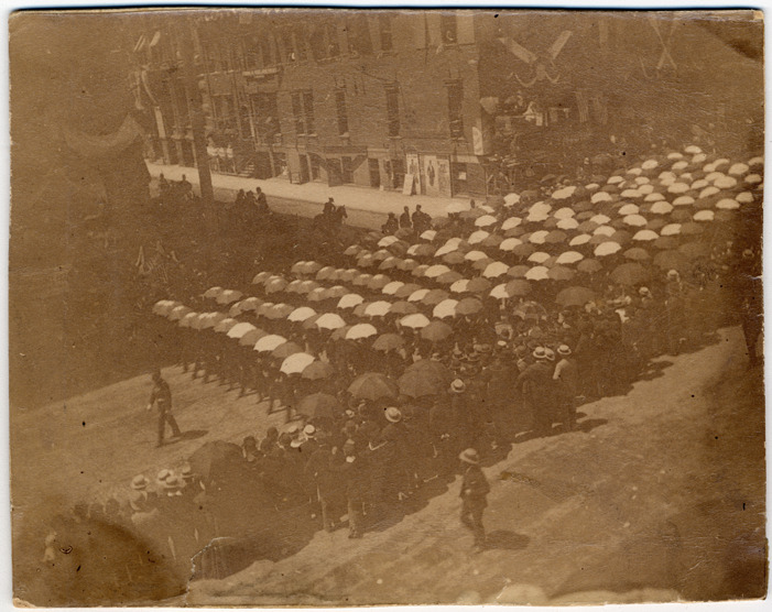 Favorite this☆ Elks on parade Description: Group of individuals carrying umbrellas march in formation down a street; spectators watch from side. Handwritten on back: "Elks (?) at time of Adm. Dewey's visit to Det." Details Resource ID: DPA3522 Subject: Elks (Fraternal order) Parades--Michigan--Detroit Albumen prints Photographic prints Date Issued: Unknown year Format: 1 photographic print mounted on mat board ; image 3.75 x 4.5 in. Member of: Burton Historical Collection Filing Location: D/Parades Rights: Physical rights are retained by DPL. Copyright is retained in accordance with U.S. copyright laws.