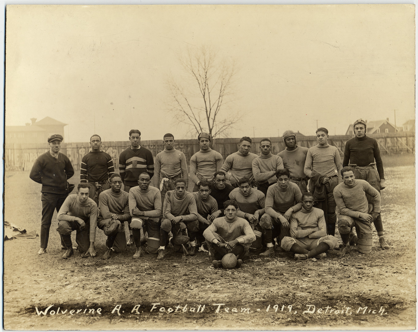 Group of men wearing football uniforms pose in field; some men wearing or carrying football helmets; man on far left wears sweater and cap; man in front row has football. Printed on front of photograph: "Wolverine A.A. Football Team, 1919, Detroit, Mich."