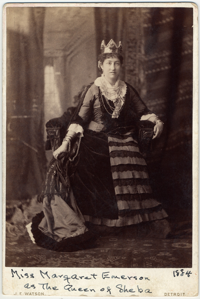 Studio portrait of a woman dressed in costume and seated on chair; woman wearing beads, crown and dress with ruffled collar. Handwritten on front: "Miss Margaret Emerson as the Queen of Sheba, 1884." Printed on front: "J. E. Watson, Detroit." Handwritten on back: "Taken in spring of 1884." Printed on back: "J. E. Watson, 236 Woodward Avenue, Detroit, Mich., duplicates of this picture can be had at any time."