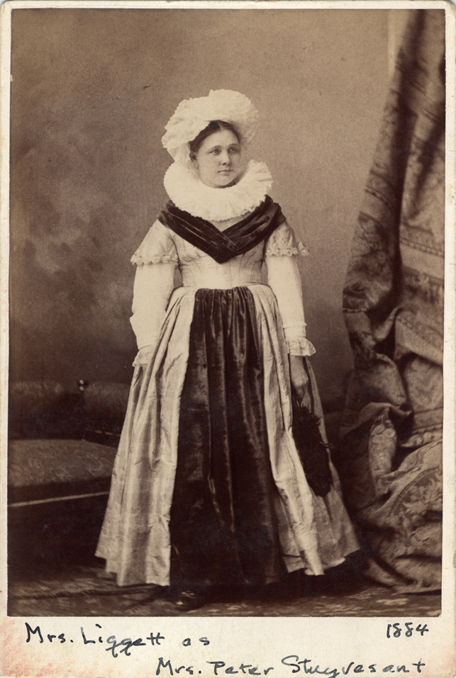 Studio portrait of a woman dressed in costume. Woman wears ruffled bonnet and dress with large ruffled collar. Handwritten on front: "Mrs. Liggett as Mrs. Peter Stuyvesant, 1884." Handwritten on back: "Taken in spring of 1884." Printed on back: "J. E. Watson, 236 Woodward Avenue, Detroit, Mich., duplicates of this picture can be had at any time."