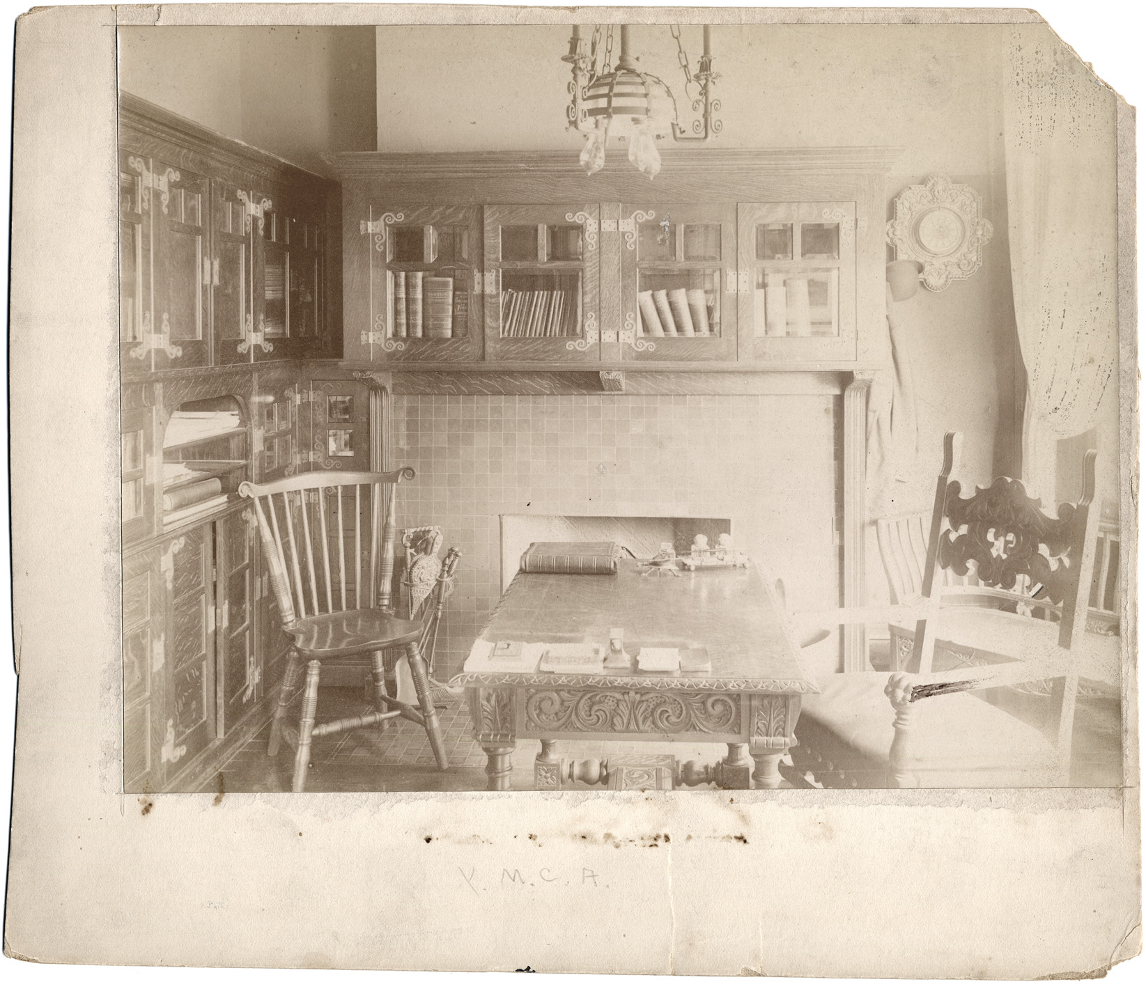 Favorite this☆ Library in Y.M.C.A. building Description: Table with writing implements and book; two wooden chairs. Glass-fronted bookcases, including one built over tiled fireplace. Stamped on mat back: "1127." Handwritten on mat back: "Library Y.M.C.A. bldg. 314. 57." Details Resource ID: DPA3543 Subject: Young Men's Christian Association (Detroit, Mich.)--Libraries Association libraries--Michigan--Detroit Albumen prints Photographic prints Date Issued: Unknown year Format: 1 photographic print mounted on mat board ; image 7.5 x 9.5 in. Member of: Burton Historical Collection Filing Location: D/Organizations-Young Men's Christian Association Note (Content): From Charles L. Clark Estate Rights: Physical rights are retained by DPL. Copyright is retained in accordance with U.S. copyright laws.