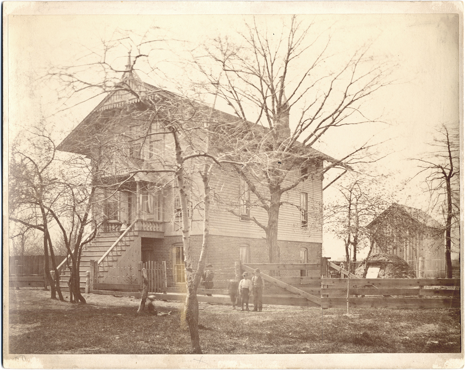 Clapboard building on raised brick foundation, viewed at an angle from street. Several children in front. Farm buildings beyond. Leafless trees; board and wire fences. Handwritten on mat back: "Zo[ar Orphan A]sylum, 1881. [?] River Road & Fort St. 2a."