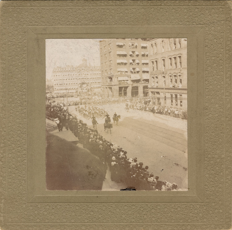 Favorite this☆ Parade honoring Admiral Dewey Description: Crowd lines both sides of broad street as uniformed men on horseback lead marching men. Viewed from a height. Tall buildings all around. Parade route goes around corner. Handwritten on mat back: "Dewey Day. June 9th, 1900. Fort Street. 68." Details Resource ID: DPA3547 Subject: Dewey, George, 1837-1917 Spanish-American War, 1898 Parades--Michigan--Detroit Photographic prints Date Issued: 1900-06-09 Format: 1 photographic print mounted on mat board ; image 3.5 x 3.25 in. Member of: Burton Historical Collection Filing Location: D/Parades-Dewey Day Rights: Physical rights are retained by DPL. Copyright is retained in accordance with U.S. copyright laws.
