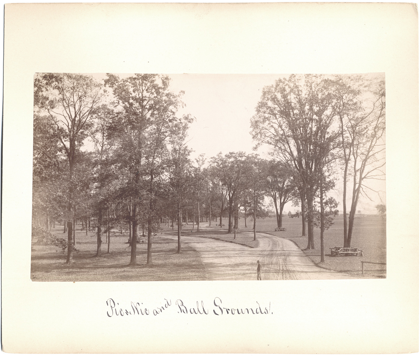 Favorite this☆ View of Belle Isle Description: Man stands at fork in the road in a wooded area; log benches surround some trees; field to the right. Handwritten on front: "Pic-Nic and Ball Grounds." Handwritten on back: "1888." Details Resource ID: DPA3577 Subject: Belle Isle Park (Detroit, Mich.) Albumen prints Photographic prints Date Issued: 1888 Format: 1 photographic print mounted on mat board ; image 4.5 x 7.75 in. Member of: Burton Historical Collection Filing Location: D/Parks-Belle Isle Rights: Physical rights are retained by DPL. Copyright is retained in accordance with U.S. copyright laws.