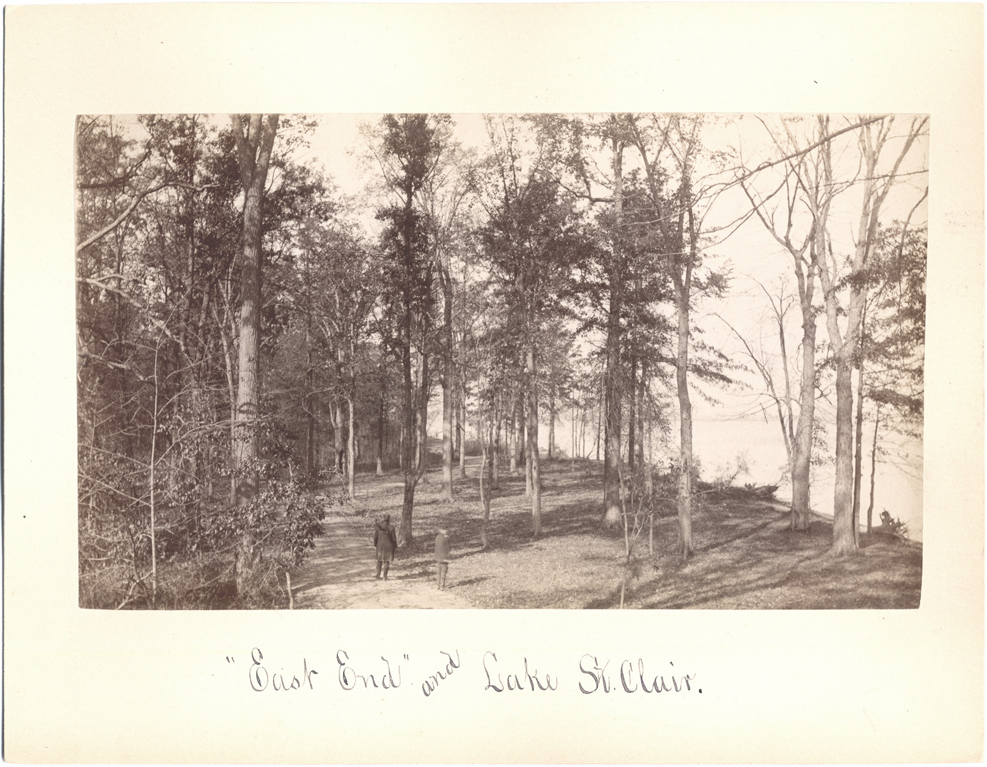 Two men walk along trail in wooded area, near the edge of a lake. Handwritten on front: "East End and Lake St. Clair." Handwritten on back: "1888."