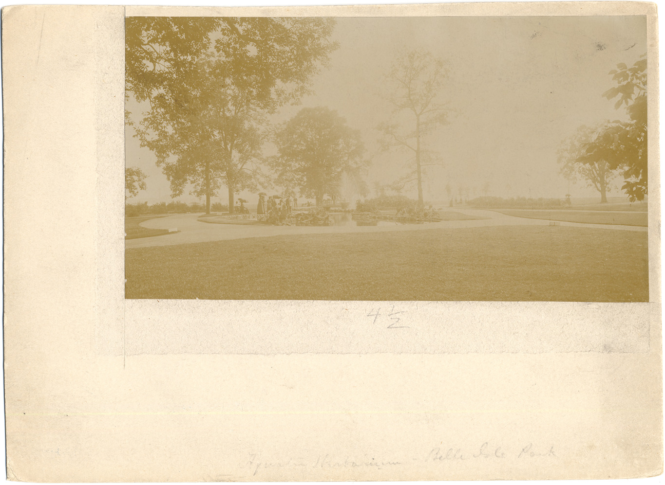 Women holding parasols gather around a pond. Handwritten on front: "Aquatic Herbarium, Belle Isle Park."