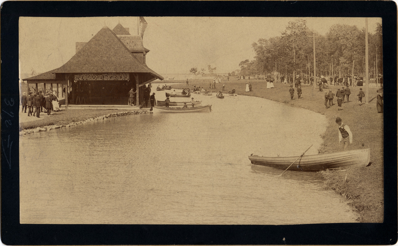 Side view of Belle Isle boathouse and canal; man with rowboat on bank in foreground; people in rowboats on canal; people walking along the banks. Sign on the side of boathouse: "Notice - parties wanting row boats will please go to the upper end of office, fill out application blank and pay at cashiers window. Terms - row boats, 25 cents per hour, cushioned and carpeted, 35 cents per hour; row boats from first boat in the morning until 2 p.m. only 75 cents." Handwritten on back: "Boat House, lower end of Belle Isle." Stamped on back: "C. E. Alvord, Detroit."