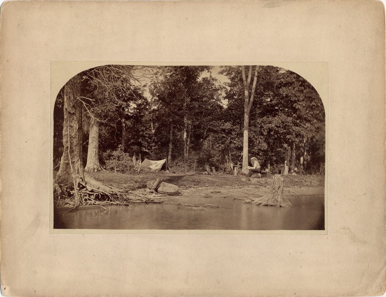Photo taken from river, showing small camping tent pitched on shore of Belle Isle, rubber raft at water edge. Man with mosquito netting hat sits nearby. Handwritten on back: "Camp of A.C. Bowman, F.J. Stevenson, Bert Campau on Hog Island in 1869; for early use of rubber boats, see The Beaver, Spring, 1955, p. 46-51." Handwritten on back of duplicate: "Taken by F.J. Stevenson."