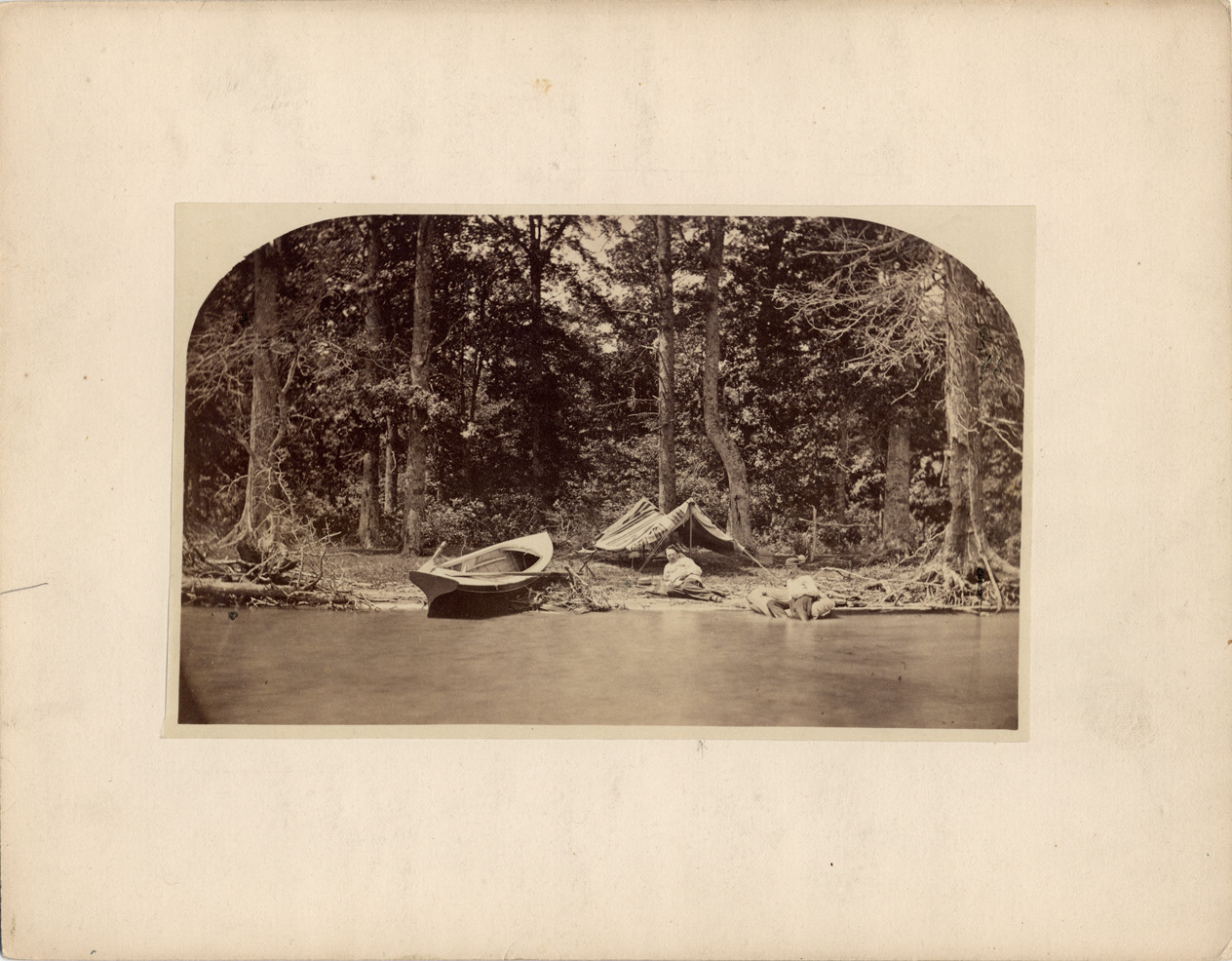 Man rests under small camping tent pitched on shore of Belle Isle. Small canoe docked nearby, and another man resting in small raft. Handwritten on back: "Taken by F.J. Stevenson, 1866; for early use of rubber boats, see The Beaver, Spring 1955, p. 46-51."