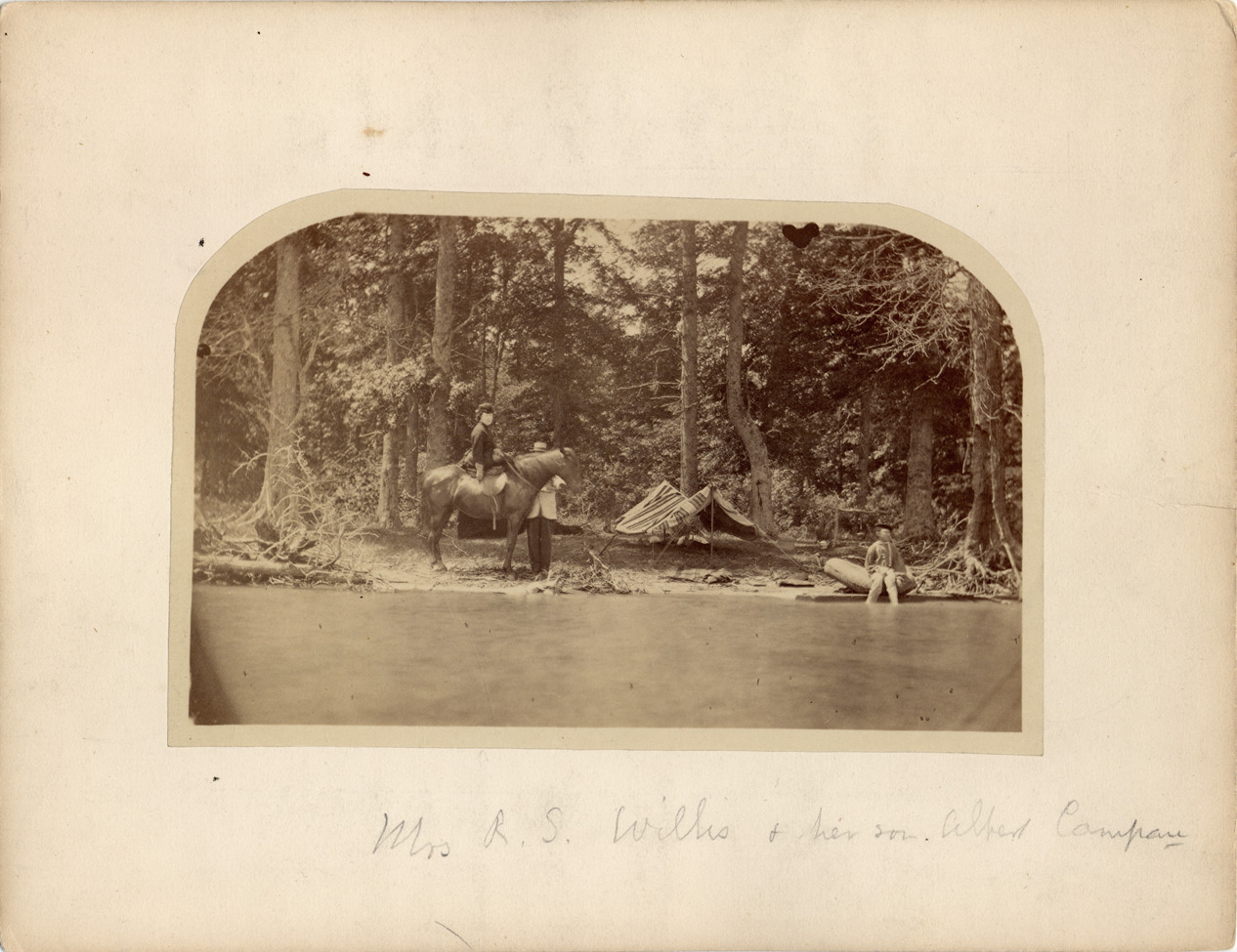 Small tent pitched on shore of Belle Isle. Small boy sits on shore, identified as Albert Campau. Woman rides horse nearby, identified as Mrs. Richard Storrs Willis, widow of J. Barnabas Campau. Unidentified man stands beside horse. Handwritten on front: "Mrs. R.S. Willis & her son Albert Campau." Handwritten on back: "Taken by F.J. Stevenson, 1866; Mrs. Richard Storrs Willis (Alexandrine M. Sheldon) was the widow of J. Barnabas Campau and mother of Dr. Albert Campau; for early use of rubber boats, see The Beaver, Spring 1955, p. 46-51."
