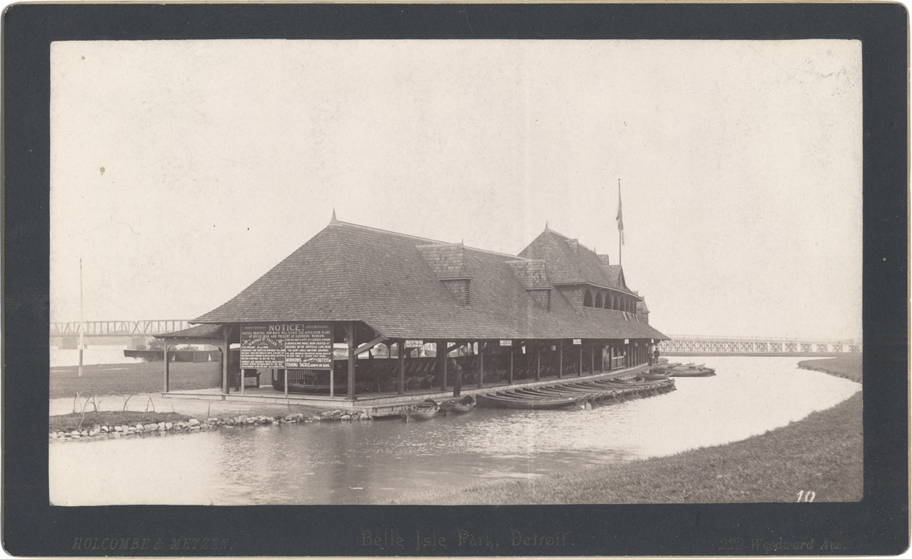 Brick boathouse on Belle Isle. Long line of rowboats docked outside, notice board of prices mounted on end. Belle Isle Bridge in background. Printed on front: "Holcombe & Metzen, Belle Isle Park, Detroit, 222 Woodward Ave." Handwritten on back: "Boat house, lower end of Belle Isle."