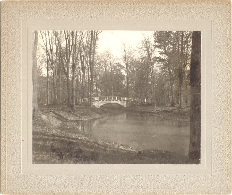 Small stone bridge on Belle Isle park, arching over narrow river.