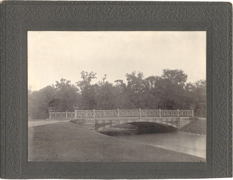 Small steel bridge on Belle Isle, with ornate designs along sides. Handwritten on back: "Belle Isle, Detroit, Mich., 1900?"