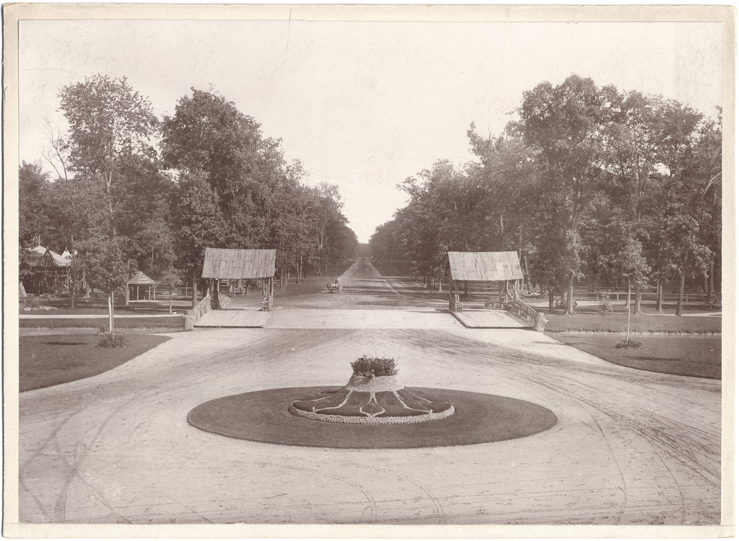 View over bridge on Belle Isle. Right and left sides of bridge have small shelters built over them. Small floral garden in front, long street stretching out in background. Handwritten on back: "East or Central Ave - Belle Isle; Photo by E.H. Husher & Co."