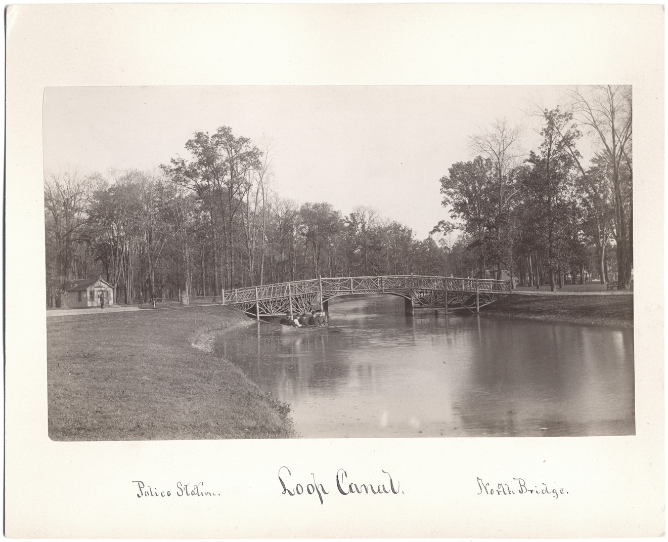 Small wooden bridge on Belle Isle; group of men in a canoe in canal below. Small building to left, identified as Police Station. Handwritten on front: "Police Station, Loop Canal, North Bridge." Handwritten on back: "1888."