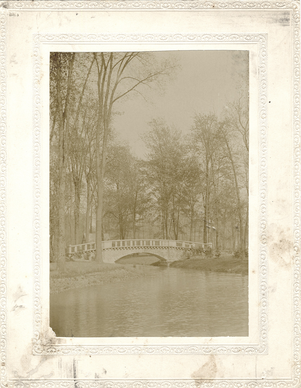 View of stone bridge over canal in a wooded area on Belle Isle.