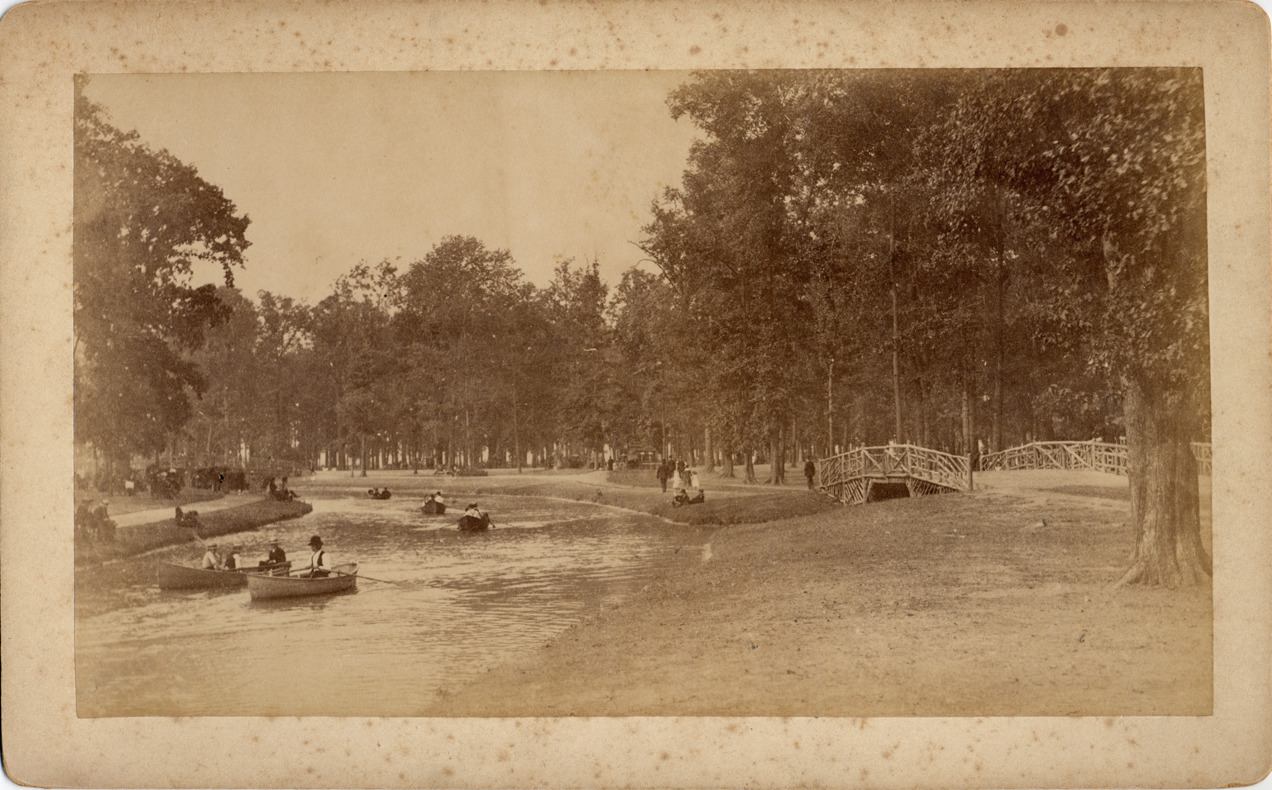 Men row boats on canal near rustic bridge; wooded area. Stamped on back: "From Alvord & Co., exclusive commercial photographers, 55 Rowland St., Detroit, Mich., ground floor gallery."