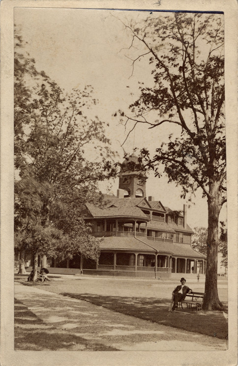 View of Belle Isle Casino; wooden-frame building with veranda; man seated on bench. Label on back: "Photographic sketches in and about the city of Detroit, consisting of street and marine views, public buildings, churches, monumental, and other objects of interest; transparences and magic lantern slides, photographed and published by Jex Bardwell." Handwritten on label: "Belle Isle Casino."