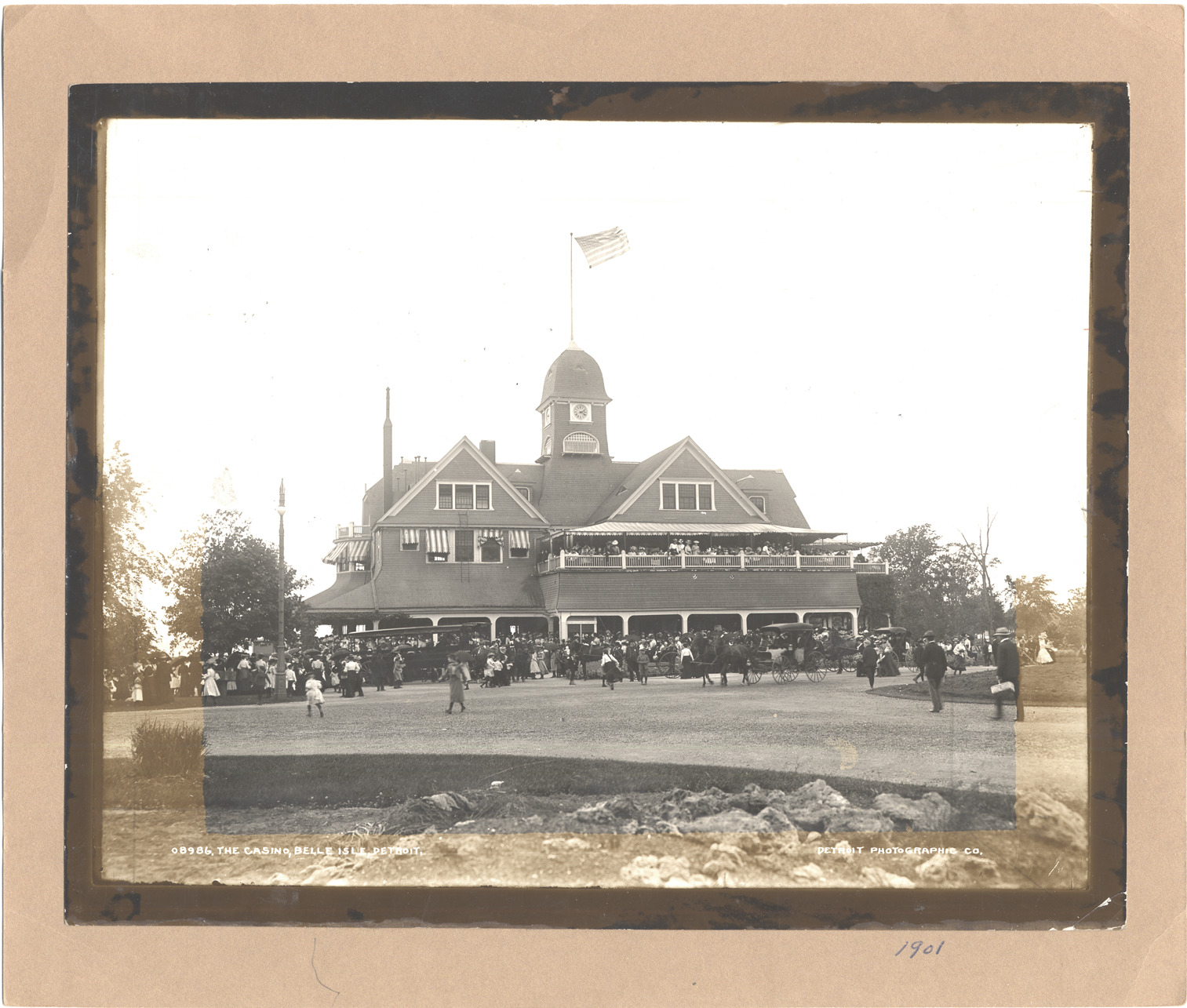 View from driveway of Belle Isle Casino; flag flying from cupola; porch crowded with people. People, carriages, and bus near building. Printed on photograph front: "08986, the Casino, Belle Isle, Detroit. Detroit Photographic Co." Handwritten on stock front: "1901." Handwritten on mat back: "68." Photograph is unevenly faded.