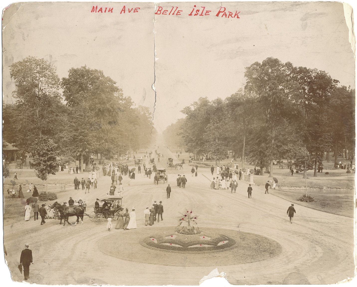 View down road from roundabout, over bridge. Road goes into woods. Several people walking on road and under trees; horse-drawn carriages on road. Handwritten on photograph front: "Main Ave., Belle Isle Park." Handwritten on mat back: "#436." Photograph and cardboard worn at edges; flower bed in roundabout enhanced with red ink.