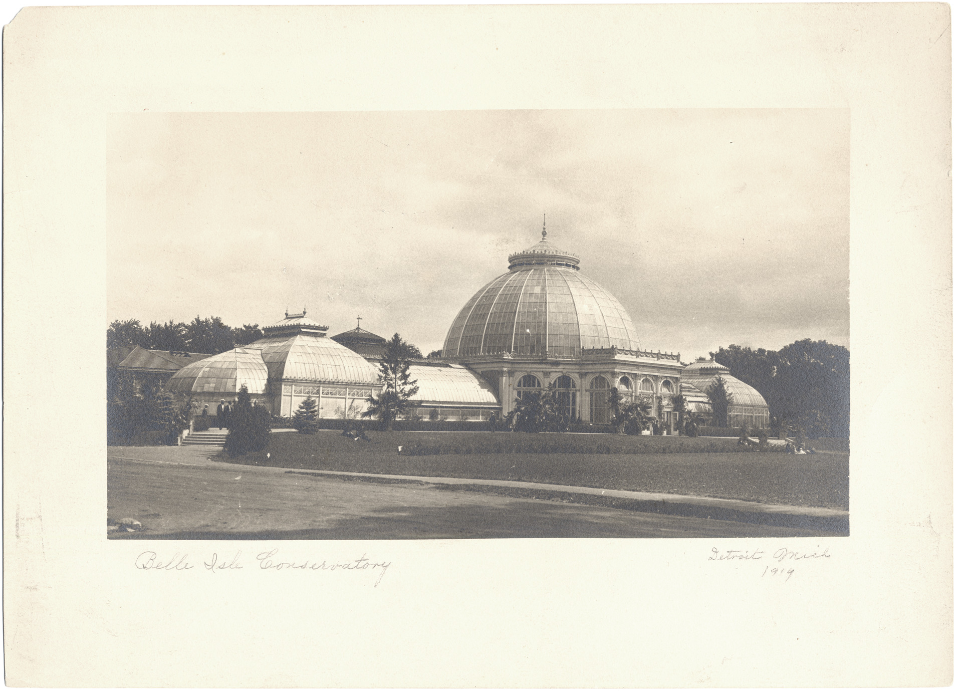 View of the Belle Isle Conservatory. Handwritten on stock front: "Belle Isle Conservatory, Detroit, Mich., 1919."