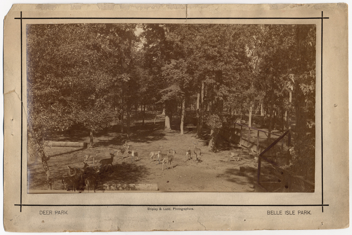 Favorite this☆ Belle Isle deer park Description: Small deer herd in clearing , with wooden fence to one side. Printed on mat front: "Deer park. Shipley & Ladd, photographers. Belle Isle Park." Mat worn and had slight tears. Details Resource ID: DPA3735 Creator: Shipley & Ladd Subject: Belle Isle Park (Detroit, Mich.) Deer--Michigan--Detroit Photographers--Michigan--Detroit Albumen prints Photographic prints Date Issued: Unknown year Format: 1photographic print mounted on mat board ; image 4.5 x 7.5 in. Member of: Burton Historical Collection Filing Location: D/Parks-Belle Isle-Zoo Rights: Physical rights are retained by DPL. Copyright is retained in accordance with U.S. copyright laws.